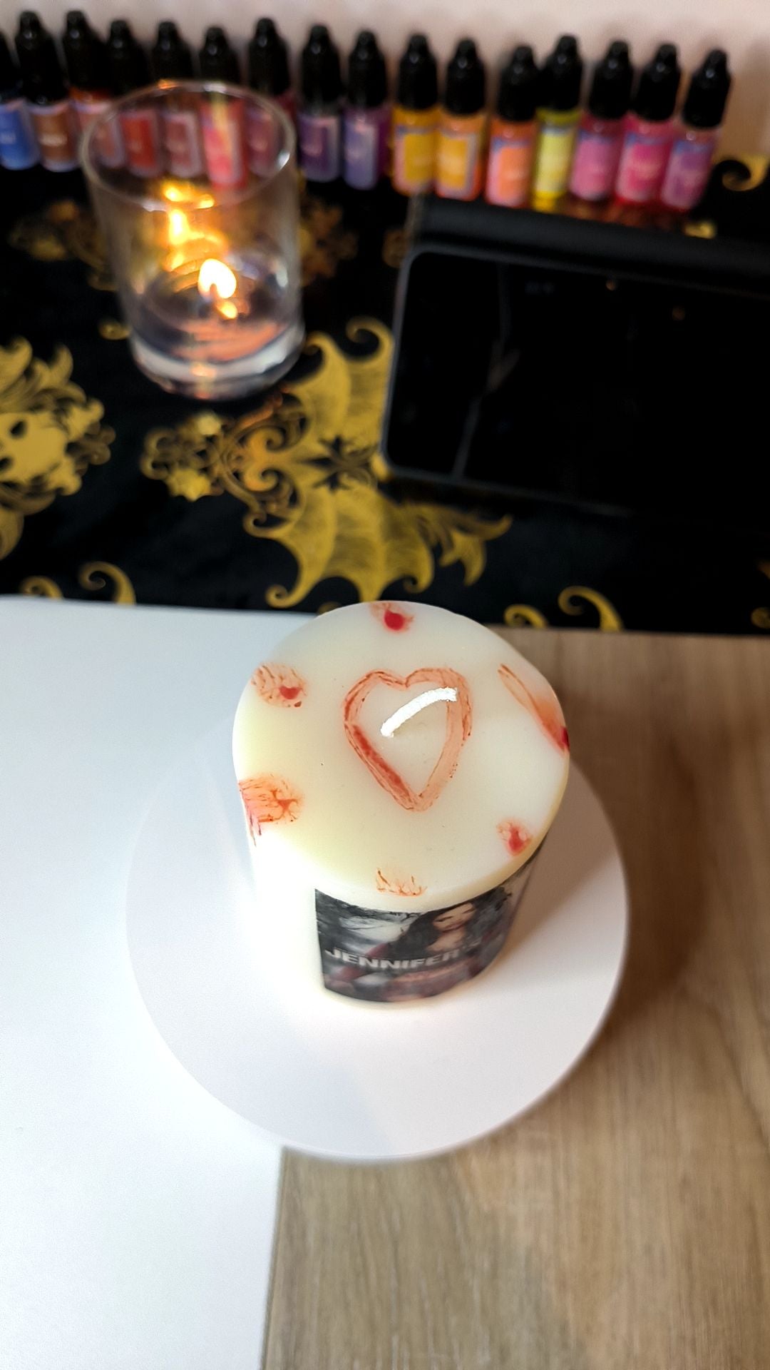 ~ Plonger dans l'ambiance d'Halloween avec cet bougie artisanale unique du film Jennifer's Body ! 🩸 Coulée à la main avec effet ensanglanté sur la bougie avec 2 photos incrusté dans la cire elle allie esthétique et qualité pour une décoration aussi effrayante qu'élégante ~